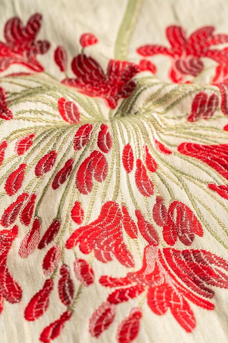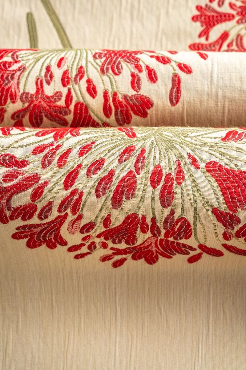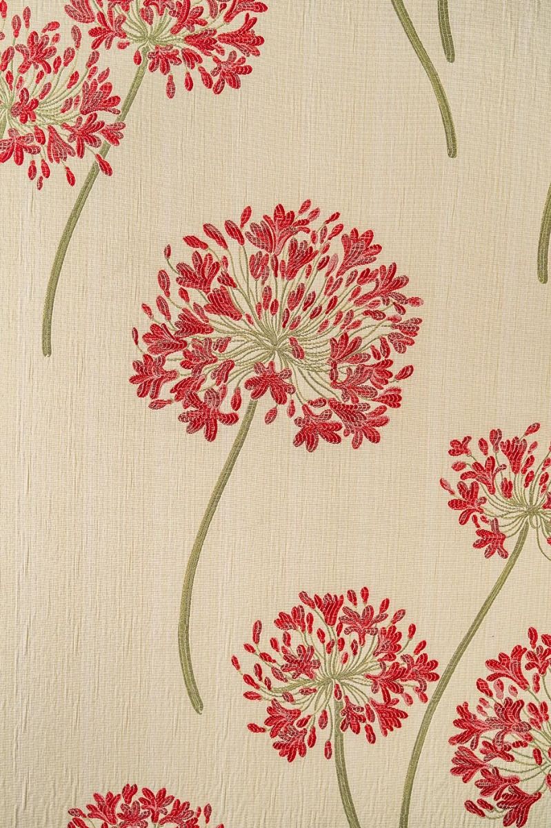 Elegant, graceful floral in delightful red with tones of creams and greens. This versatile fabric is ideal for curtains, roman blinds and loose covers. Mix and match this with Agapanthus Red Small Flower and Stripe to enhance any room in your home.
