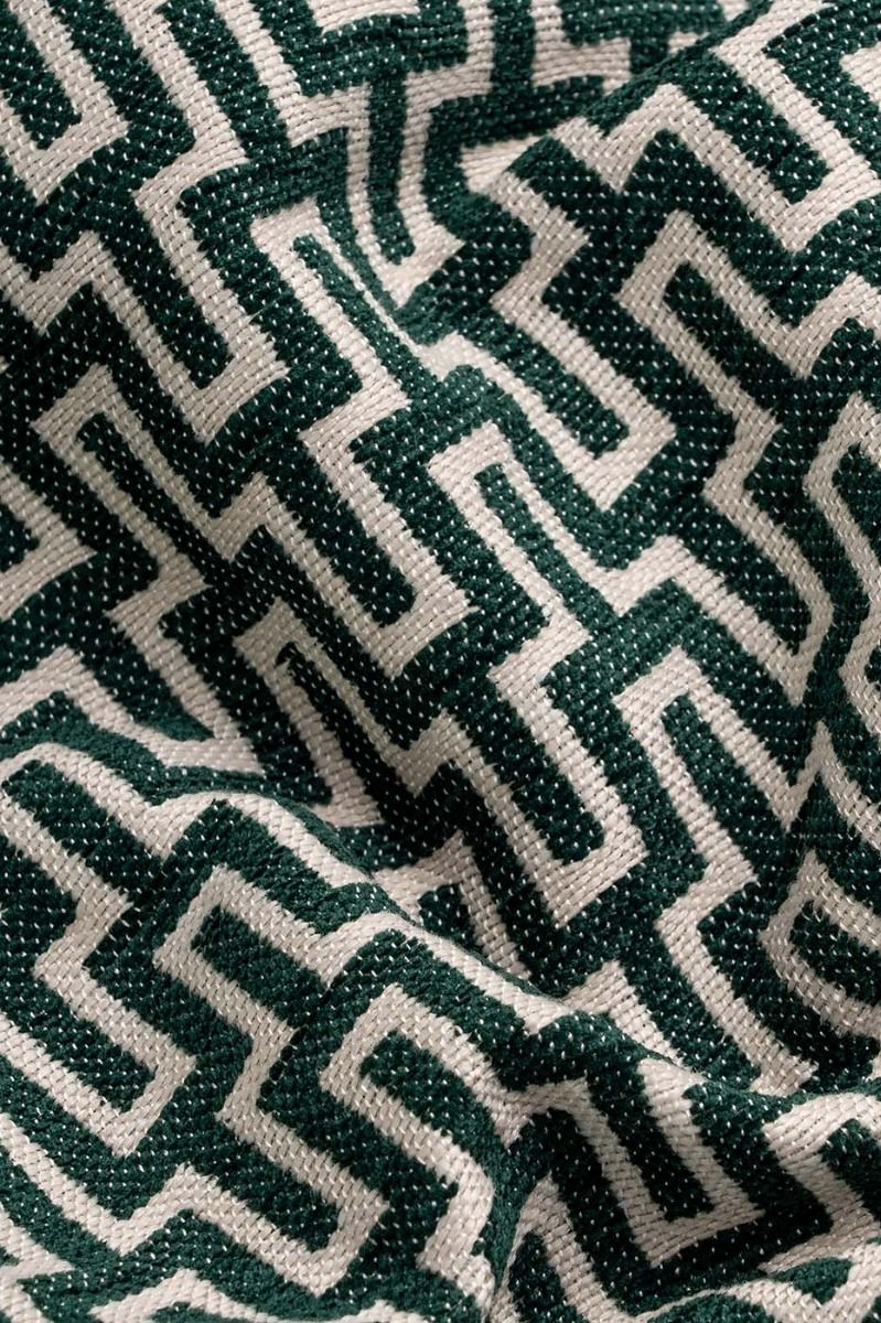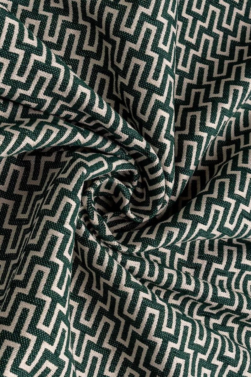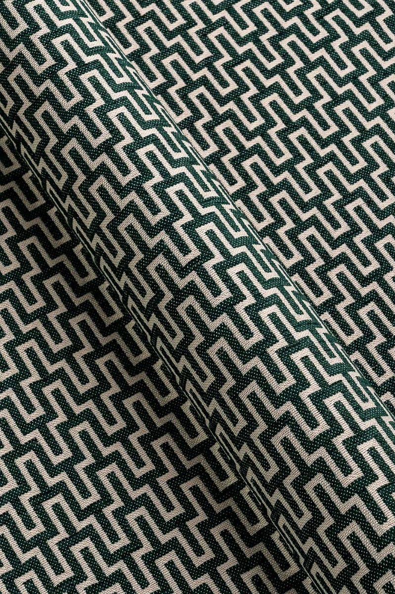 Our Aria Green Geometric fabric showcases a visually stunning design with its deep olive green backdrop and intricate beige geometric pattern. This classic colour combination effortlessly blends rich tones with a timeless aesthetic, making it the perfect choice forcurtains, Roman blinds cushions and upholstery.
