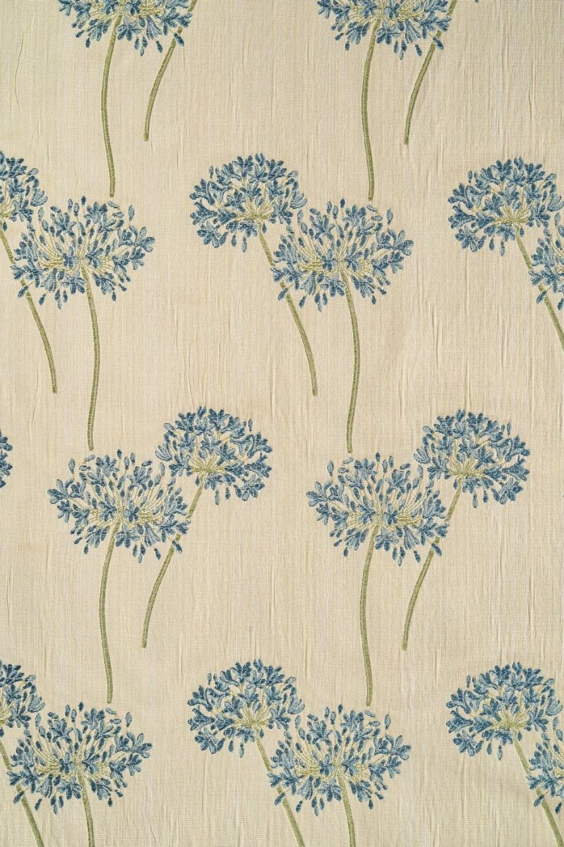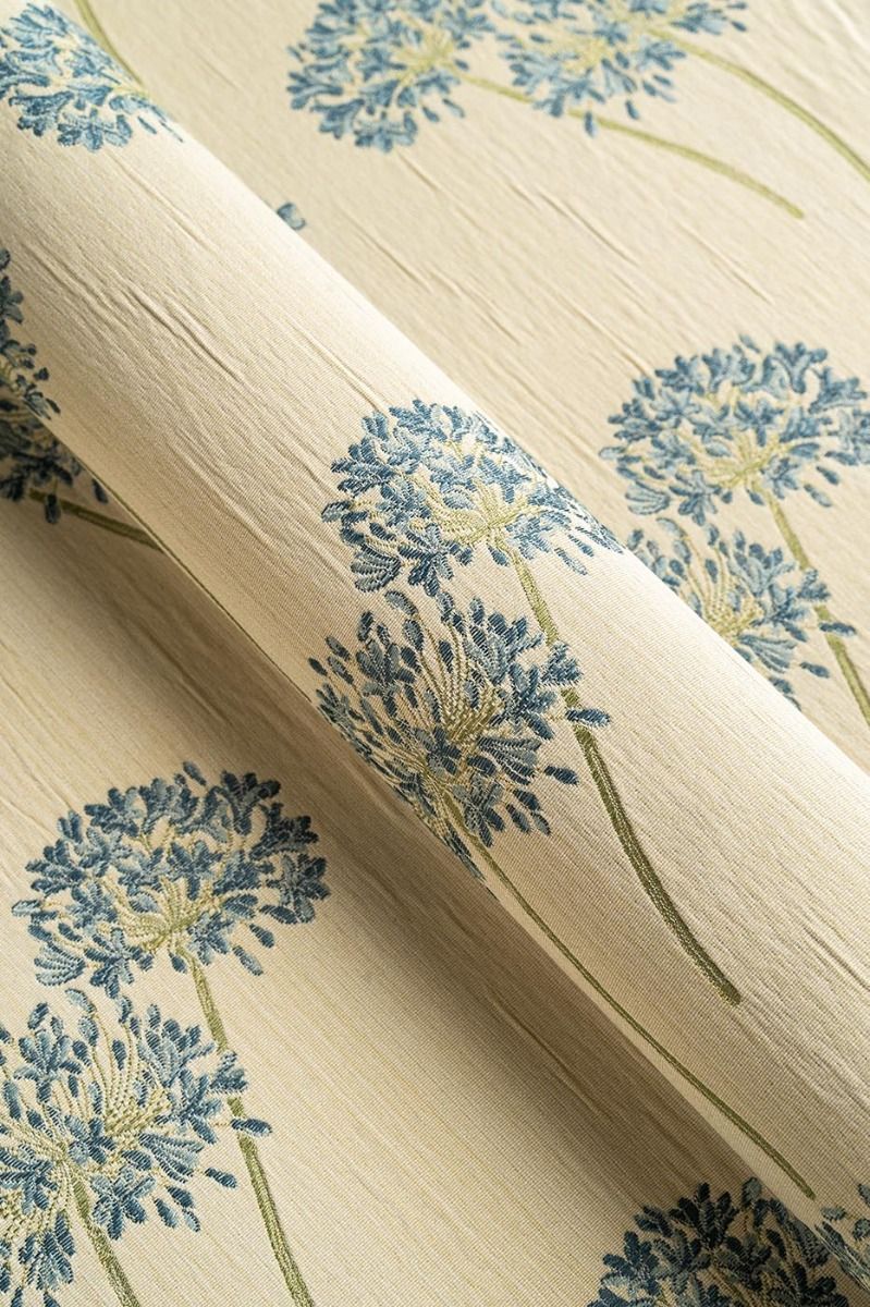 Elegant, graceful floral in delightful blue with tones of creams and greens. This versatile fabric is ideal for curtains, roman blinds and loose covers. Mix and match this with Agapanthus Blue Large Flower and Stripe to enhance any room in your home.