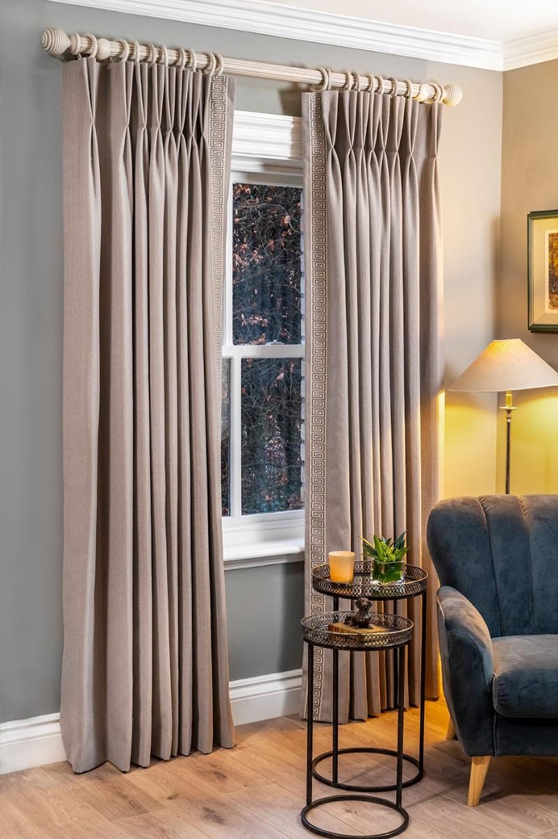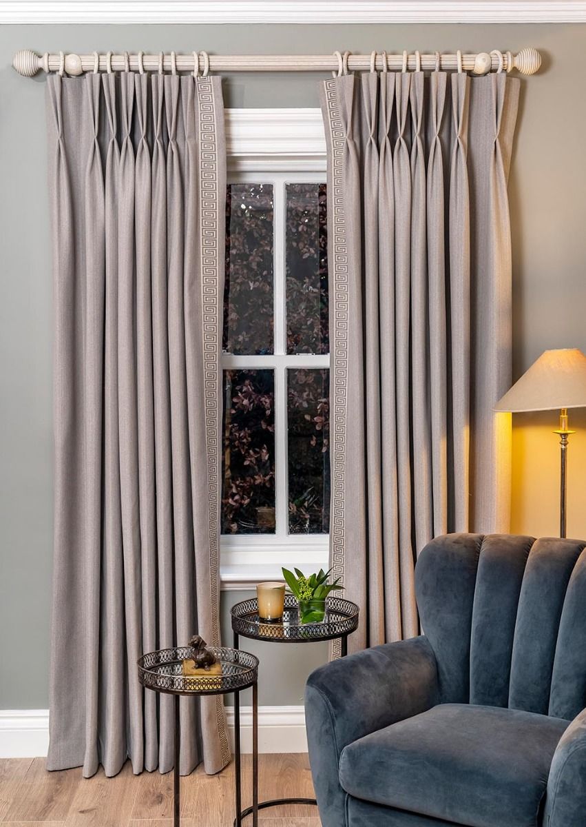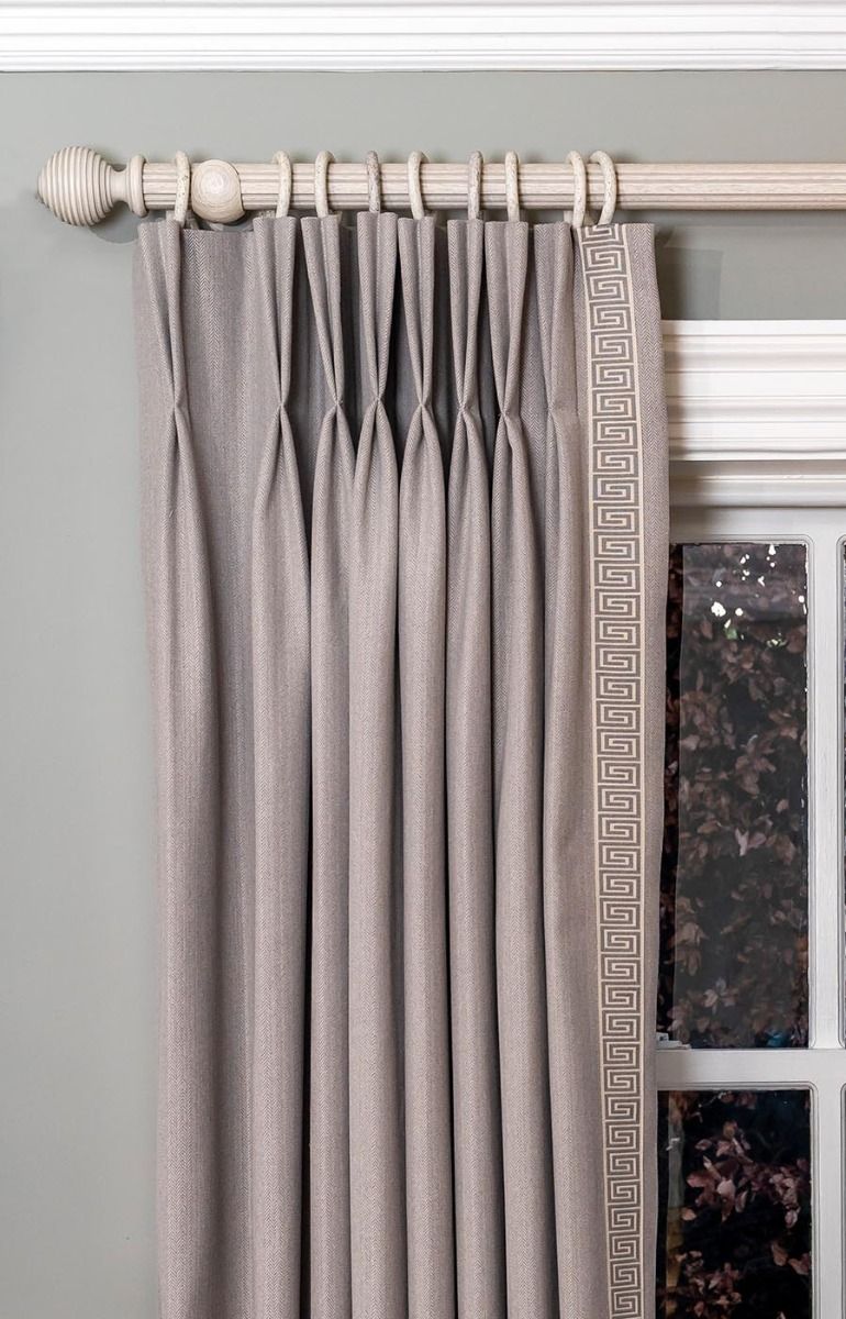 Marcel Herringbone is a beautiful plain fabric with a classic herringbone weave. One of our most popular fabrics, Marela Herringbone is a stunning addition to any room. These 90" x 90" curtains are paired with a bonded fleece lining and a modern 8" butterfly pleat and also a coordinating braid detail. Coordinating tiebacks available. Marcel Herringbone 90" x 90" is also available with a blackout lining.