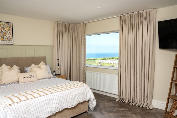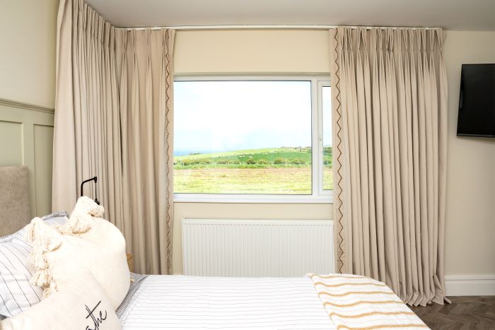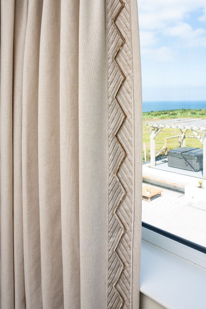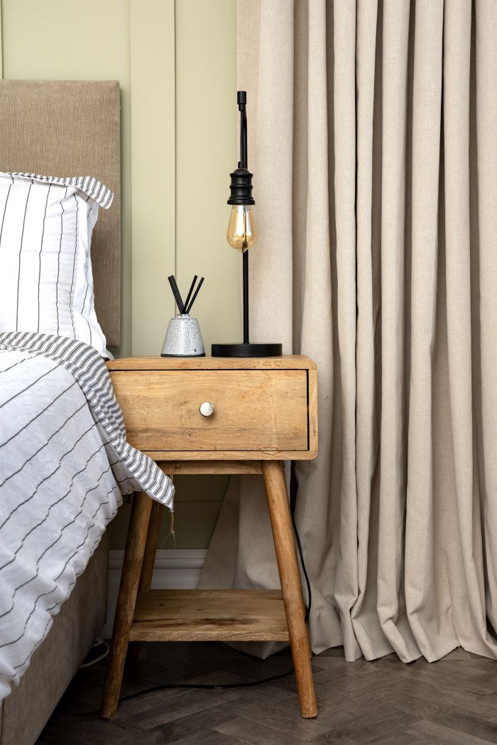 For Rebecca’s bedroom, she chose blackout made-to-measure curtains in the Como Natural fabric and Tuscany braid which are both available in-store. This fabric complements Rebecca’s interiors perfectly and finishes off the relaxing environment she set out to achieve.