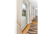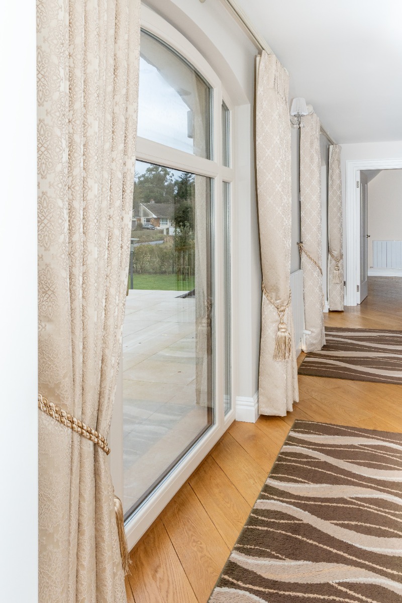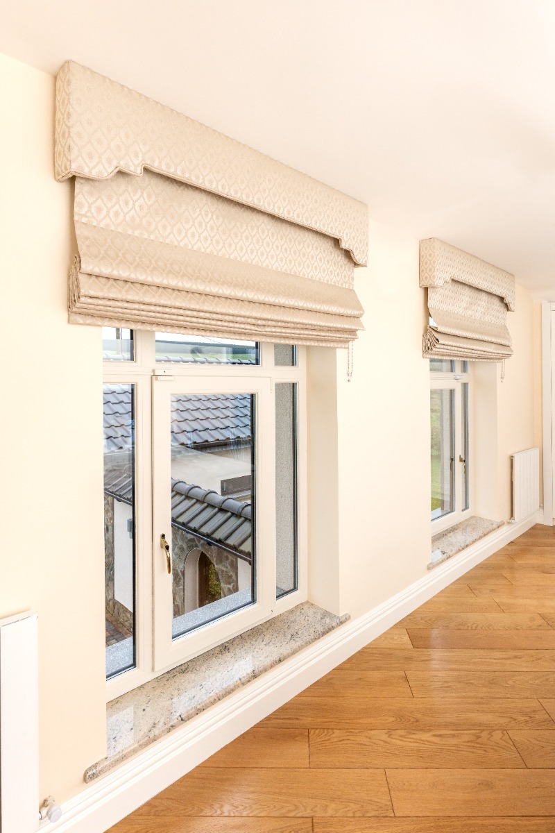 Large rooms with many windows but are smaller than those mentioned above are better suited to Roman Blinds over Curtains. The Roman Blinds are neat and tidy but still add warmth and don’t take away any light during the day. The Oslo Cream Taupe Trellis fabric is perfect for the room as it works well with the interiors.