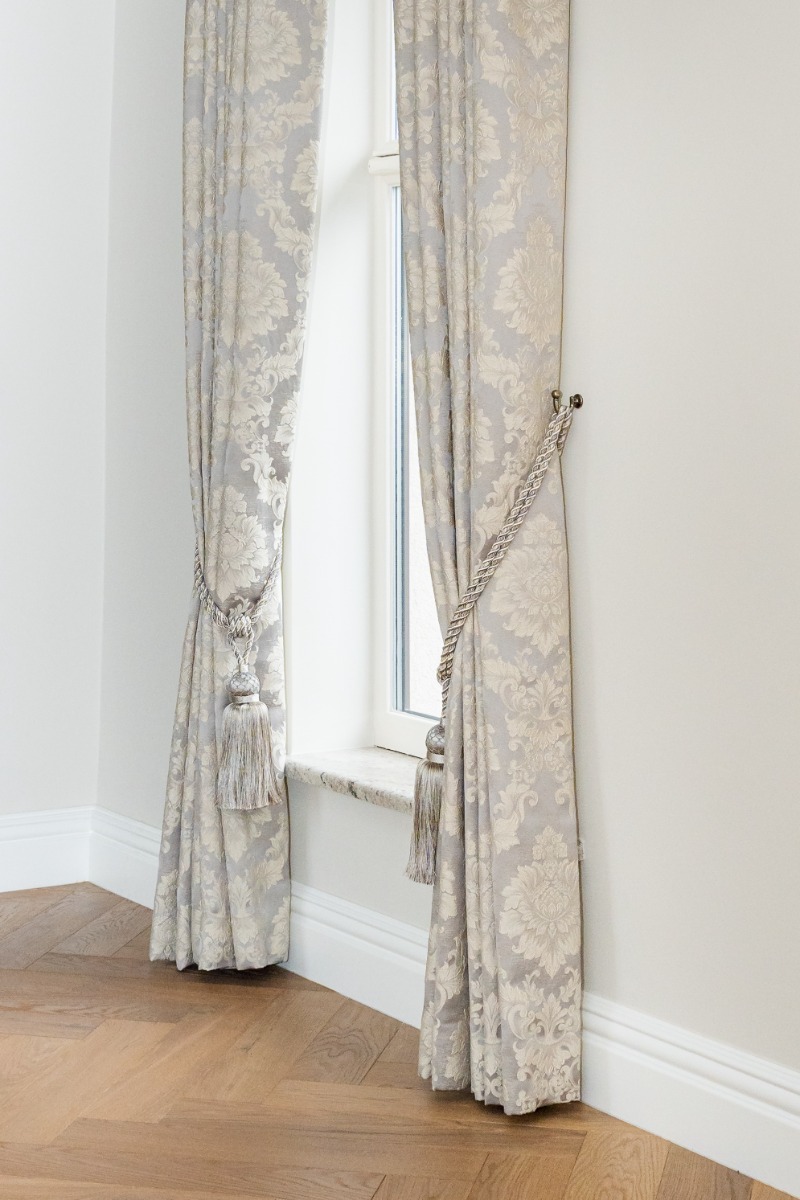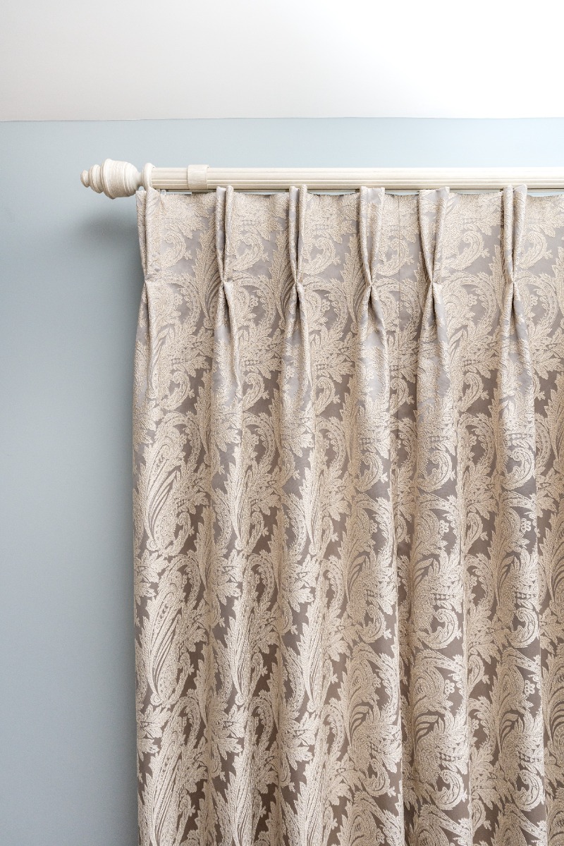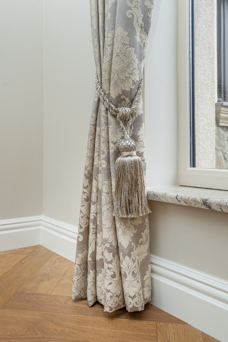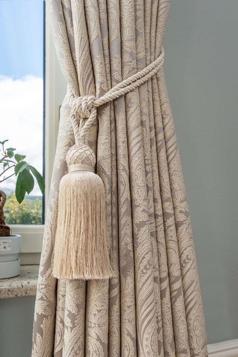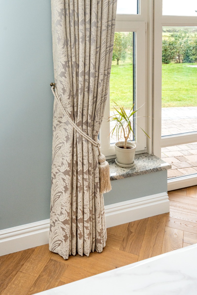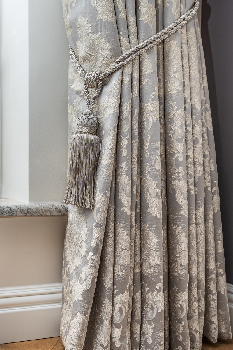 The windows in this room are quite large which means that they are perfect for floor length curtains. Floor-length curtains give a real sense of warmth and look very luxurious. Especially those that are a velvet finish. This Ascot Steel Paisley Fabric complements the room perfectly as the colour of the curtains matches the interiors and doesn’t make the room any darker by taking away any light.