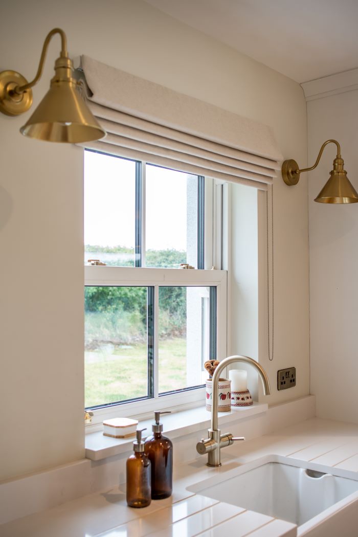 Christine collaborated with us on her kitchen and utility room. Her kitchen is the heart of the home, and Christine put a lot of effort into planning this space. She wanted to create a warm and welcoming space for her family and to host many family gatherings. For this space, she chose a Roman blind in the Cadiz Herringbone fabric. This fabric is a neutral shade but adds warmth to the room.