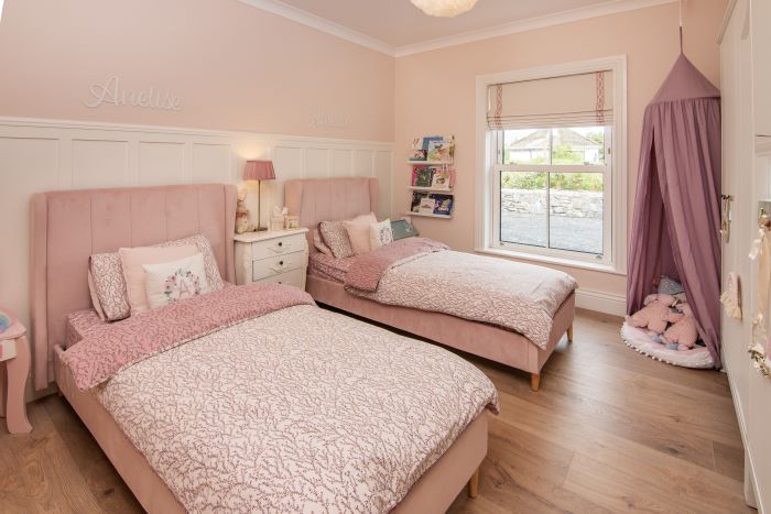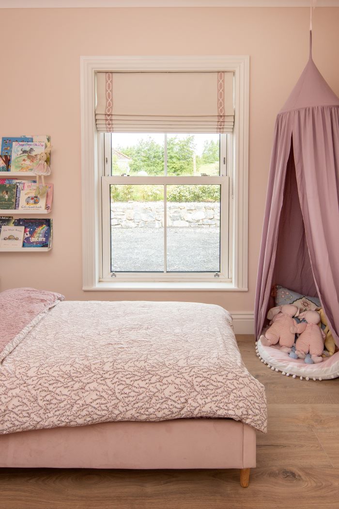 For her daughter’s bedroom, she knew it had to be girly but wanted it style to be consistent with the interiors in the rest of her home. She browsed our website and ordered samples of our fabrics and braids. Erica chose the Natural Herringbone White fabric with the Limoges Pink braid. The Herringbone fabric teamed with the pink braid gave a playful feel whilst also adding texture to the room.