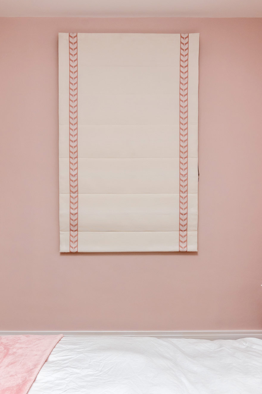 Lauren chose this simple white fabric named Linen Look White to add a pop of colour and to tie the room together Lauren chose a pink braid to match her interiors. This is a great idea for children’s bedrooms as they get older and grow out of pink and baby blue the rooms can be repainted but the curtains or roman blinds will match a more sophisticated grown-up shade. Adding a different colour braid is a great way to add colour or depth to the curtains or blinds as well as tie the room together.