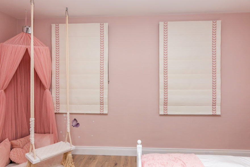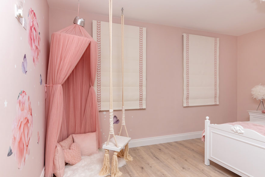 As you can see this room has many decorative features with the swing and canopy being the focal point in the room. This feature needed to be kept in mind when planning the window dressing. As there are two small windows in this room curtains would be too much but roman blinds would make the perfect addition.