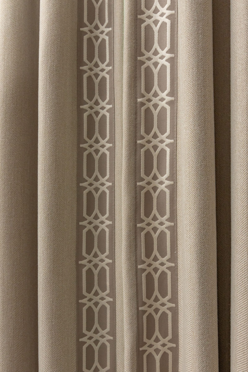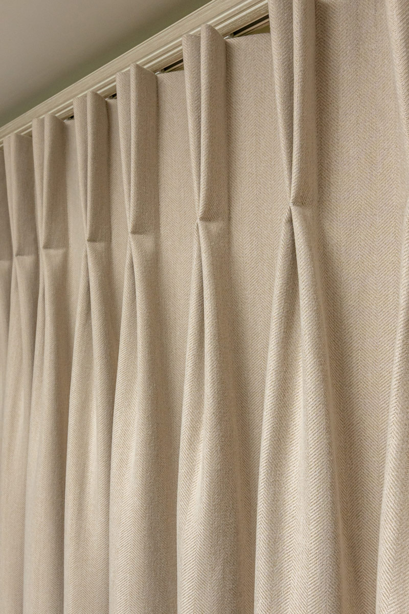 To match Lauren’s luxurious sense of style she chose full-length luxury bespoke made-to-measure curtains. She chose the most beautiful fabric which is from our herringbone collection in the shade plain grey. Our herringbone fabrics are very popular as they are simple and understated but are eye-catching and luxurious. Lauren chose a complementing braid which matched the curtains and the colour used in her master bedroom perfectly. To finish off the curtains, Lauren chose pinch pleats which again give a luxurious feel and adds an extra special touch to the curtains.