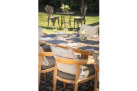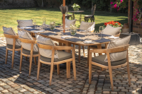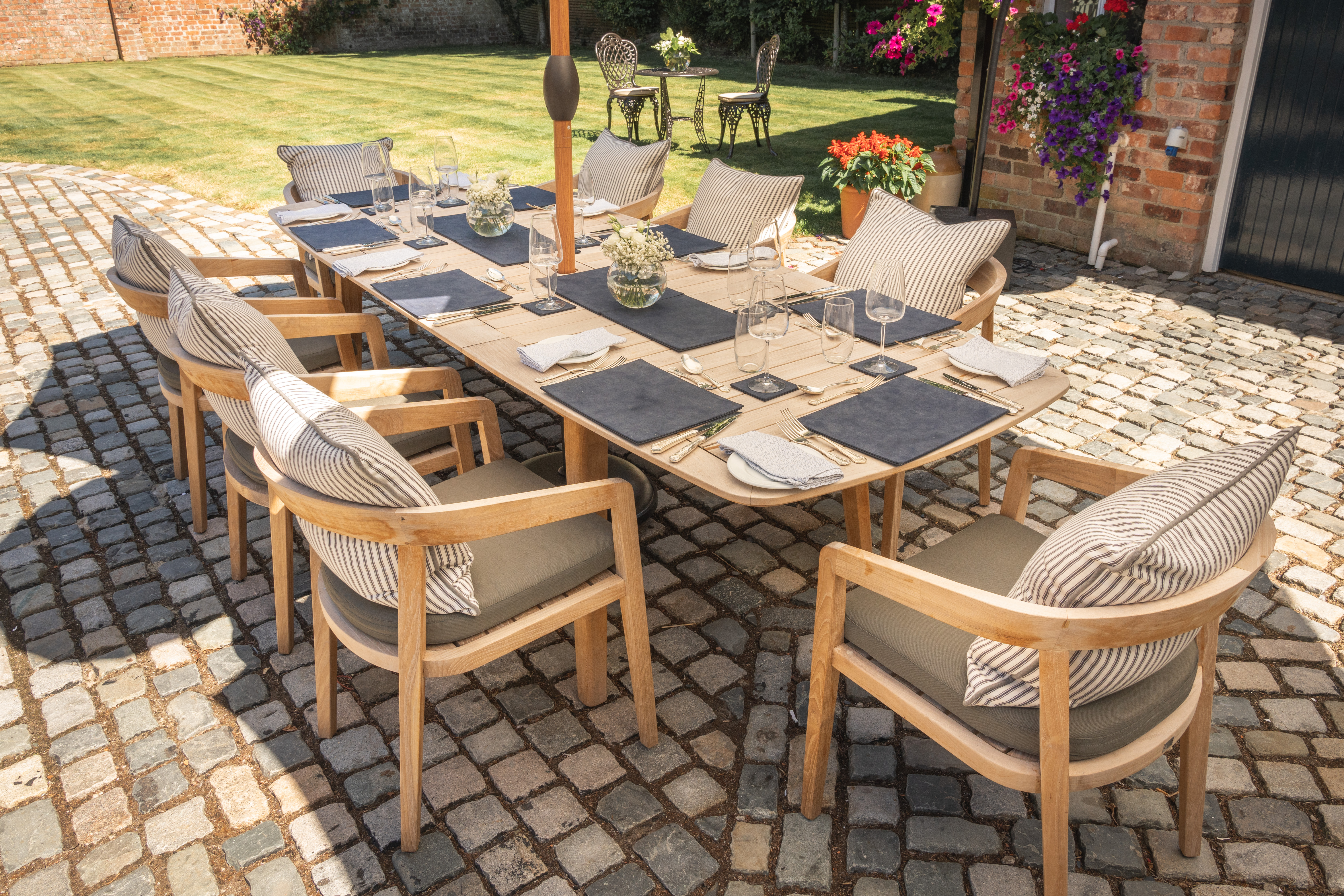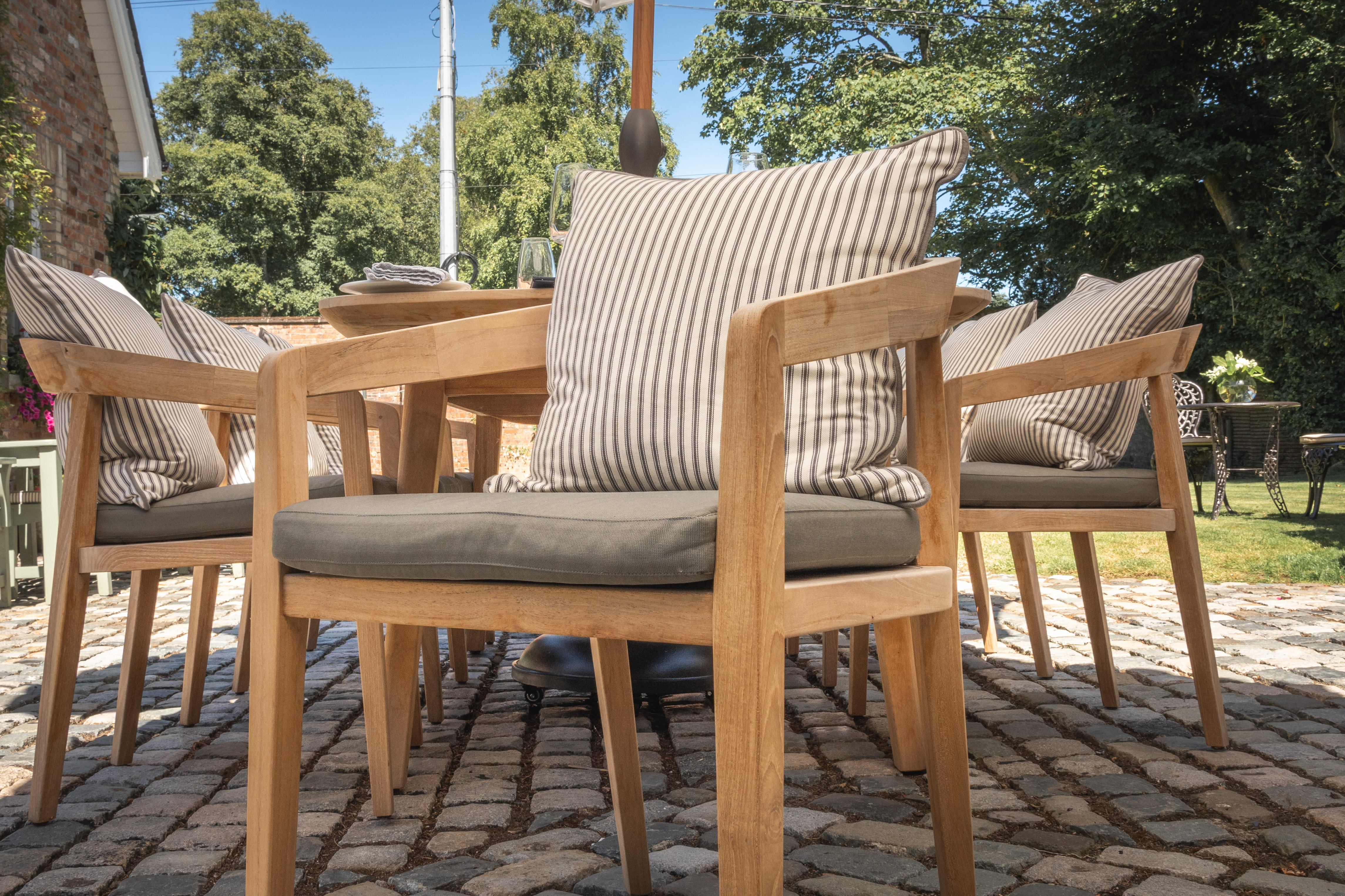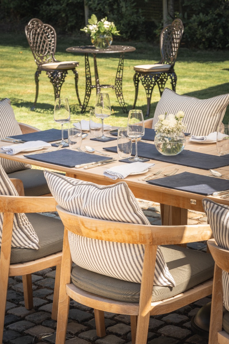 An excellent way of adding your own touch to a dining setting is by adding accessories such as cushions. Here at Material World we supply a large collection of upholstery fabrics which are perfect for outdoor furnishings. An example of this is the cushions we have placed on the chairs of the dining setting.