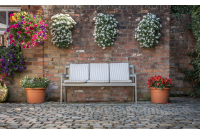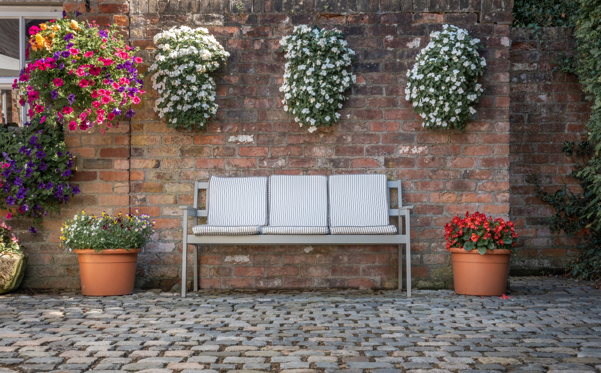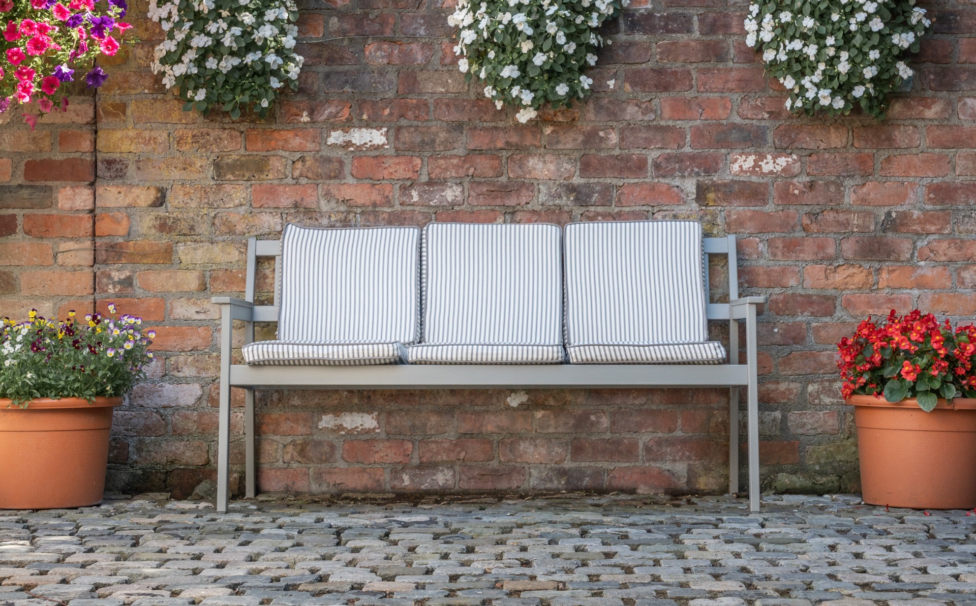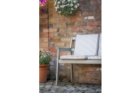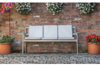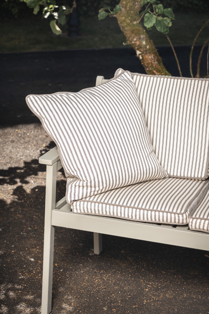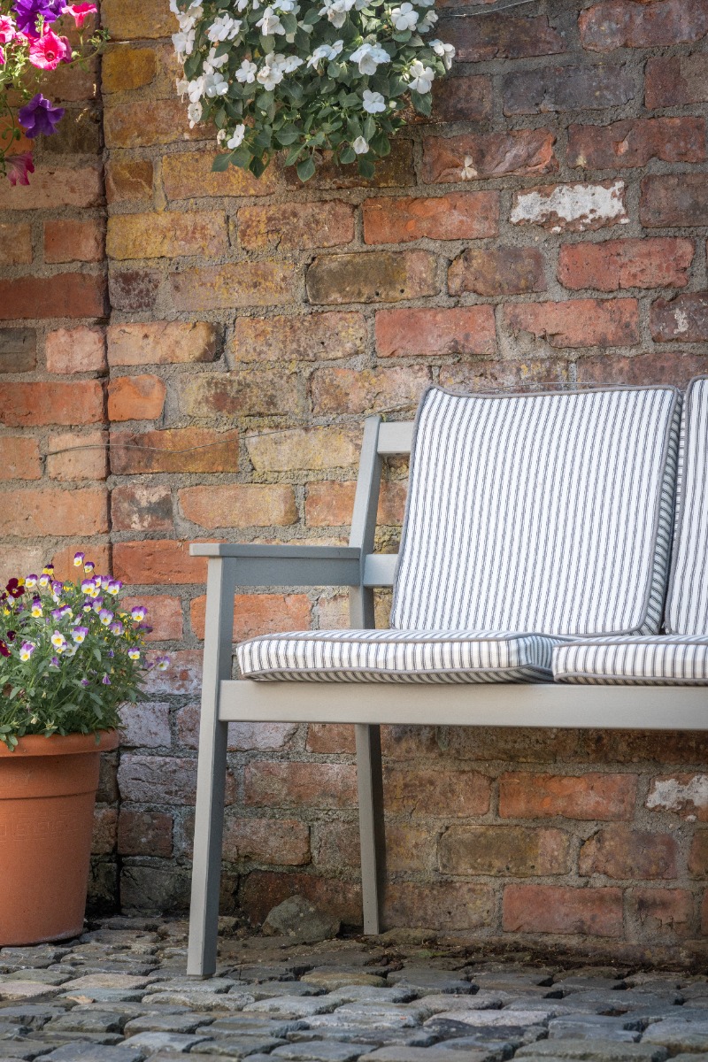 The cushions are not waterproof but they can easily be removed and stored indoors once the night draws in. Our upholstery fabrics are not just suitable for dining settings, they are also suitable for settings such as above. By adding cushions to a bench like this softens the area and makes it more comfortable and welcoming.