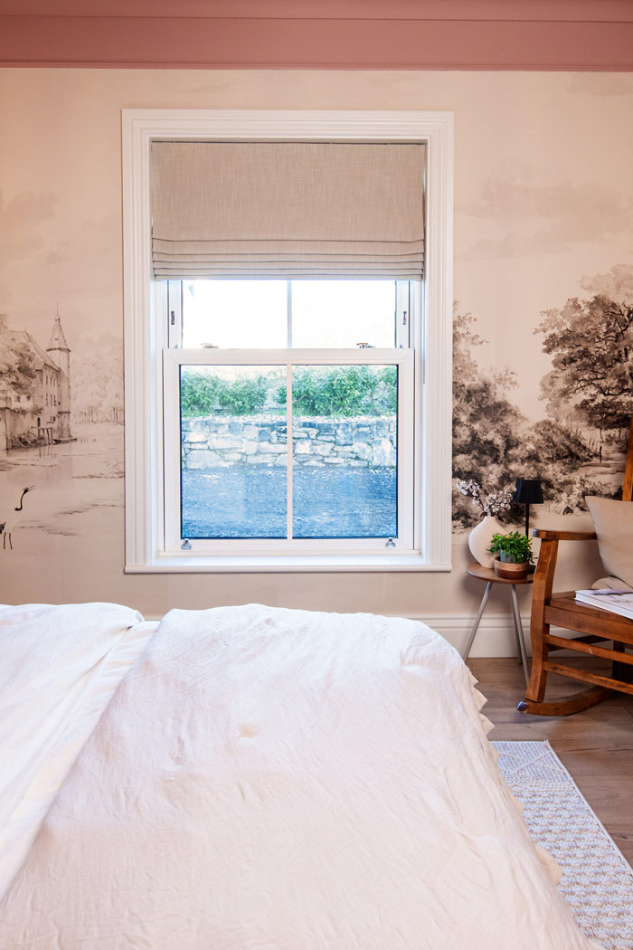 From her own personal experience, she knew she was in good hands. She wanted her guest room to be warm, and welcoming and give a sense of feeling when entering the room. She and her husband curated every aspect of the room from the beautiful wallpaper to the unique furniture and of course her bespoke Roman Blind which is the perfect finishing touch. Erica chose the Santos Oatmeal fabric for her made-to-measure Roman blind, it is rich, textured and has a subtle warmth to it so it’s not too muted. It is a neutral tone that would be perfect for any room.