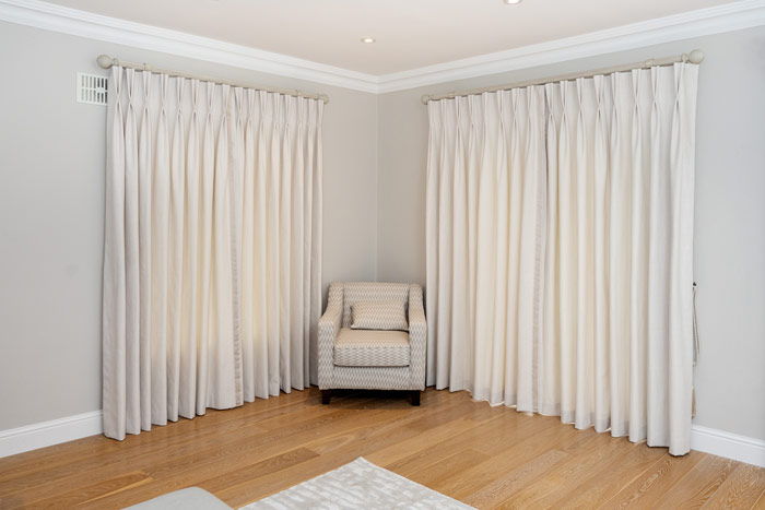 To complement the interiors in this room and to create the atmosphere which the client desired we knew exactly what fabric and window dressing the client should choose. We suggested full-length made-to-measure curtains in the fabric Dorset Herringbone Cream, a pinch pleat finish and a matching braid.