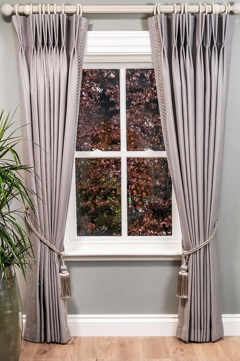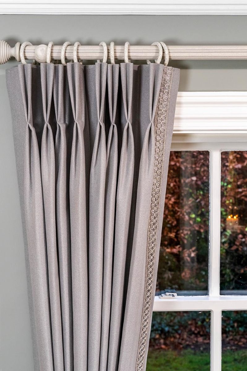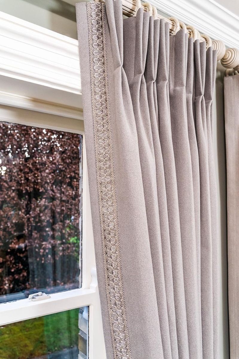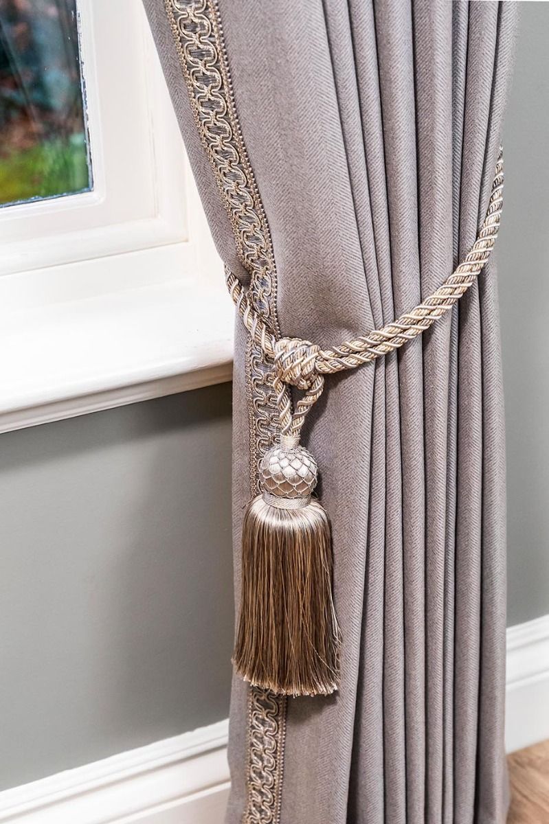 Marela Herringbone is a beautiful plain fabric with a classic herringbone weave. One of our most popular fabrics, Marela Herringbone is a stunning addition to any room. These 90" x 90" curtains are paired with a bonded fleece lining, a modern 8" butterfly pleat and a braid detail on the leading edges. Coordinating tiebacks available. Marela Herringbone 90" x 90" is also available with a blackout lining.