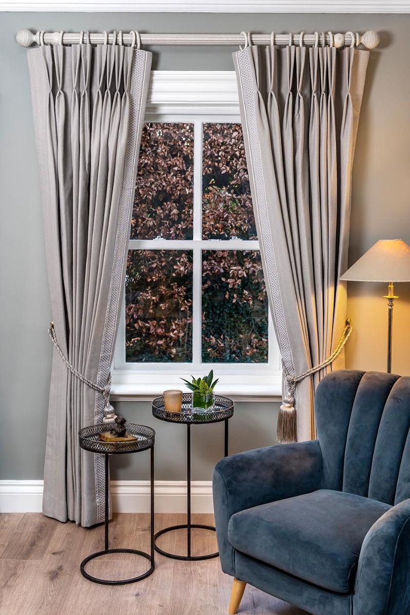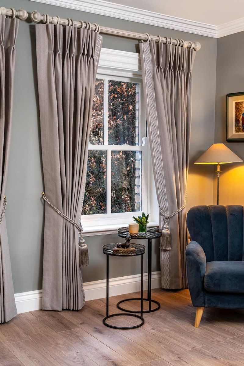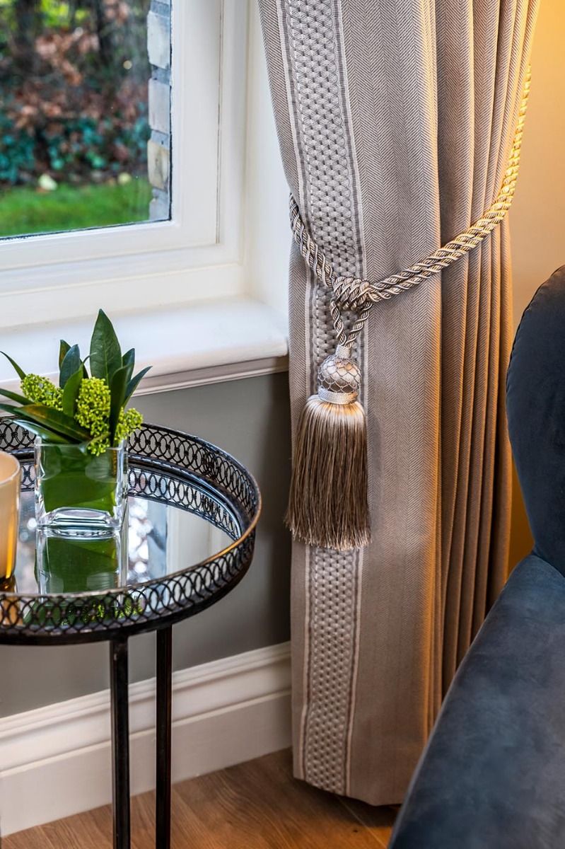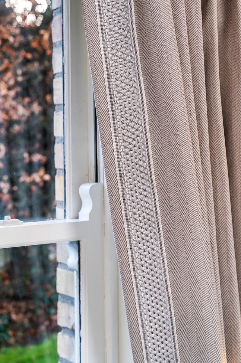 Marela Herringbone is a beautiful plain fabric with a classic herringbone weave. One of our most popular fabrics, Marela Herringbone is a stunning addition to any room. These 90" x 90" curtains are paired with a bonded fleece lining, a modern 8" butterfly pleat and our most popular wide braid detail on the leading edges. Coordinating tiebacks available. Marela Herringbone 90" x 90" is also available with a blackout lining.