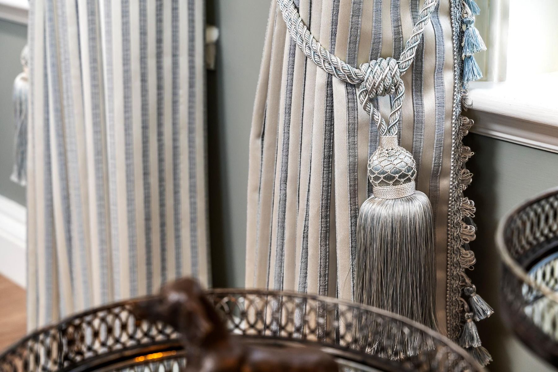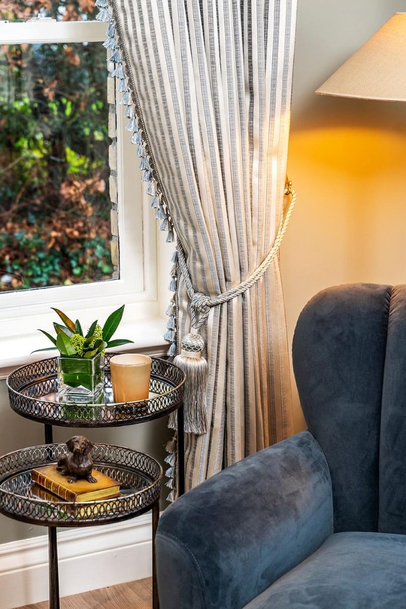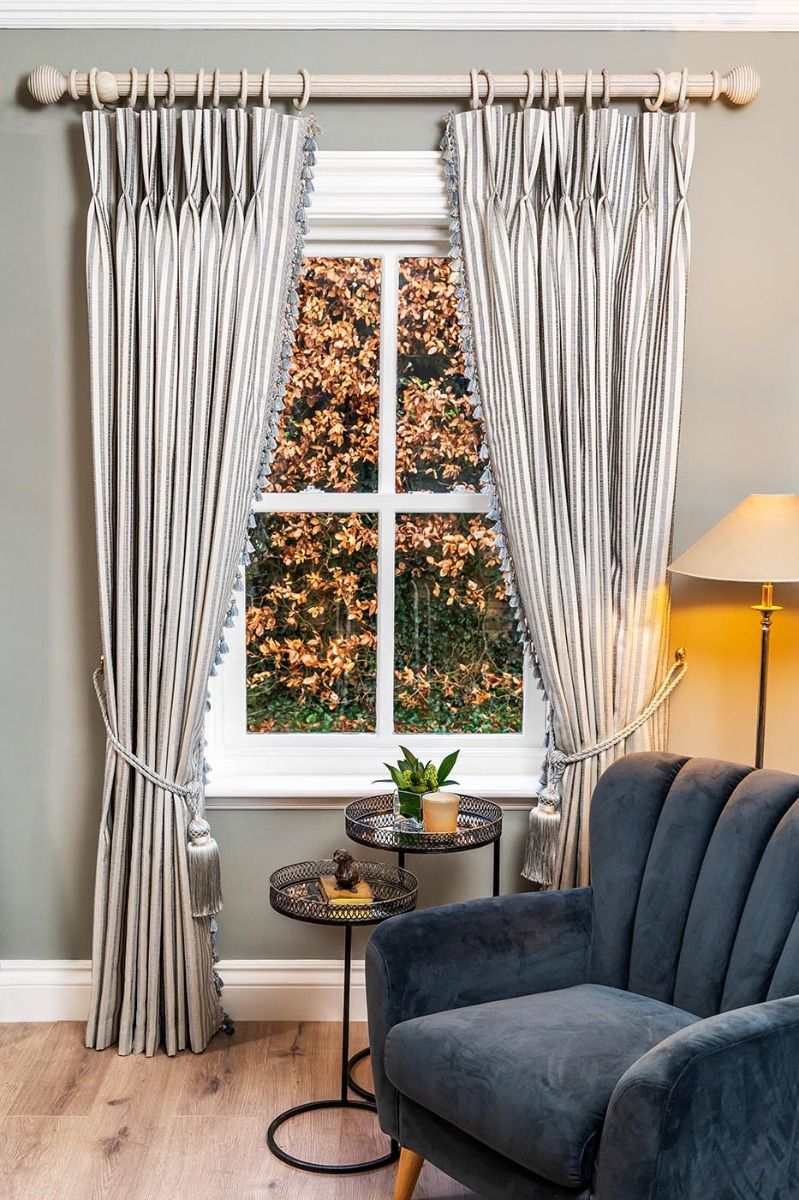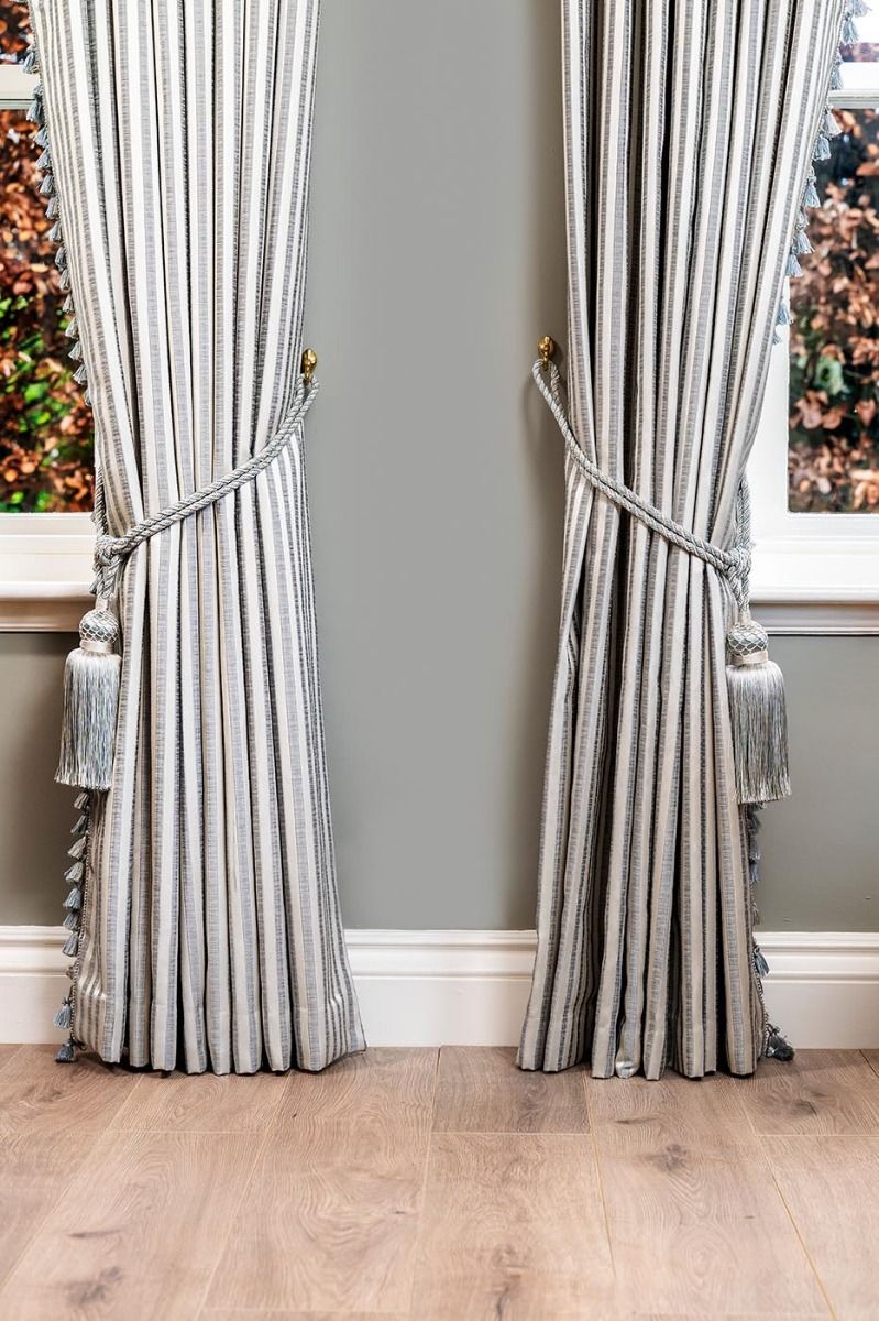 Emily Duckegg Stripe is one of our most popular fabrics. Emily drapes beautifully and has a lovely soft handle. These 90" x 90" curtains are paired with a bonded fleece lining, a modern 8" butterfly pleat and a macthing hand tied fringe to add a touch of luxury to any room. Coordinating tiebacks available. Emily Duckegg Stripe 90" x 90" is also available with a blackout lining.